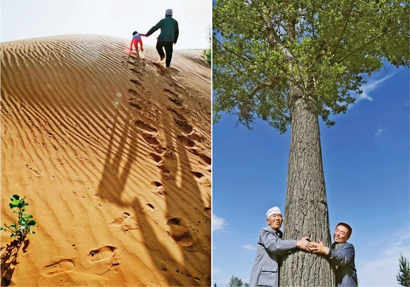 毛乌素沙地是我国四大沙地之一。1984年,陕西省榆林市靖边县的郭成旺承包了离家10公里处的荒沙地,带领全家常年吃住在沙地的简易房里,数十年矢志不移防沙治沙,为4.5万亩沙漠披上了绿装。左图:1998年8月,郭成旺老人带着曾孙行进在沙漠中。右图:2020年5月22日,99岁的郭成旺老人(左)与孙儿郭建军抱着当年栽下的第一棵杨树,向参观者介绍当年植树的情景。 新华社记者 陶明/摄