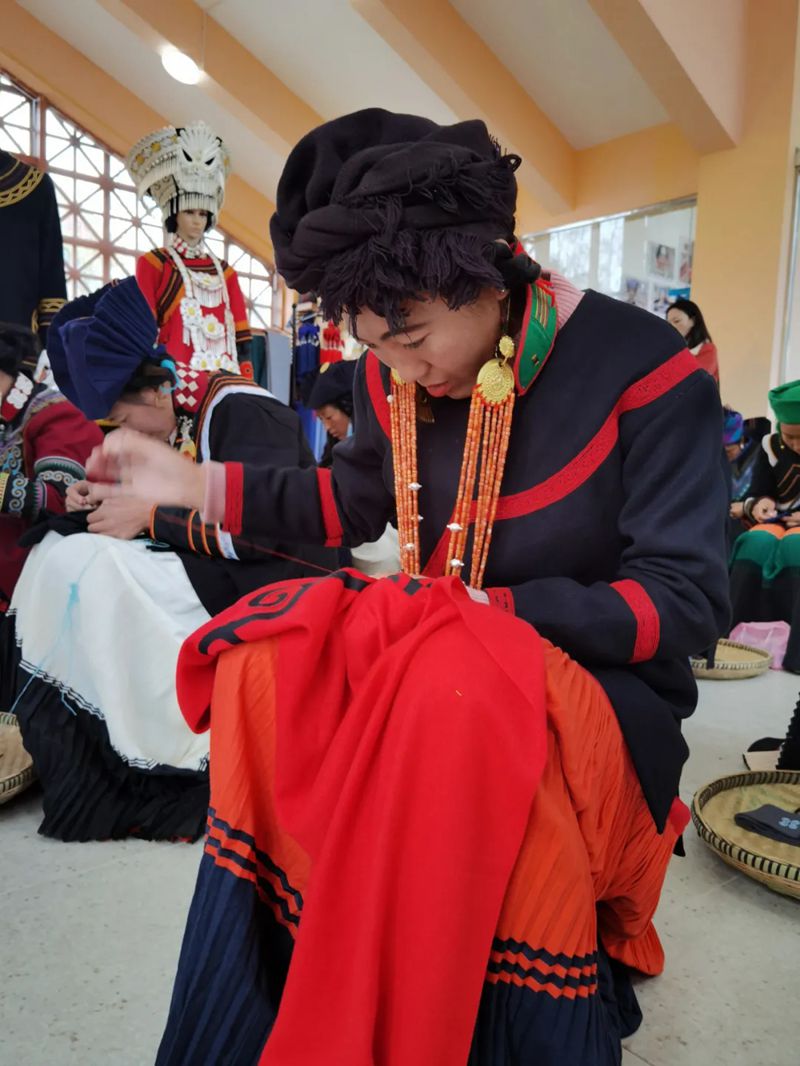 为做好易地扶贫搬迁“后半篇文章”,有效提升搬迁群众的获得感、幸福感、安全感,政府为贫困户开展免费的烹饪、电焊、彝绣等技能培训,帮助贫困户在家门口实现就业。图为搬迁群众在沐恩邸社区开设的彝绣培训班中专心工作。 童怀/摄
