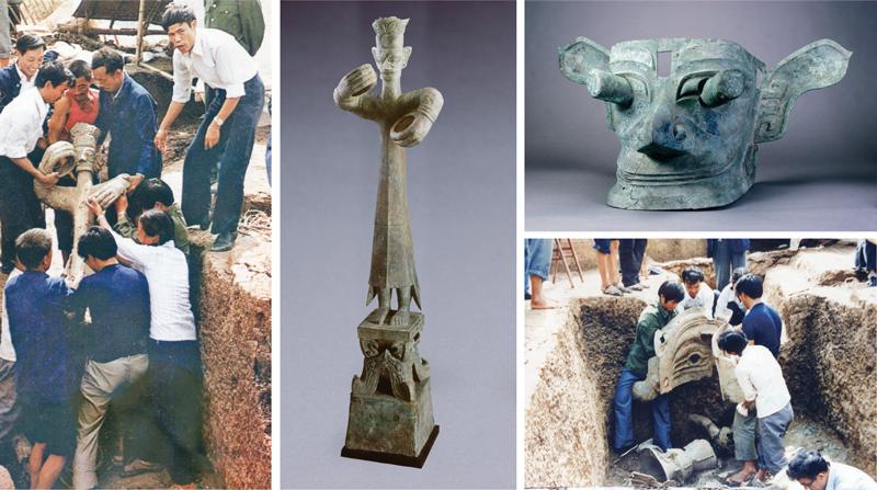 位于四川广汉的三星堆遗址发现于1927年,遗址所处年代相当于夏代晚期至商周之际。1986年,在遗址祭祀区发掘两座祭祀坑,出土金杖、面罩、铜神坛、神树、人像、面具、玉石礼器、象牙雕饰等珍贵文物1720件,揭开了早期古蜀文明的神秘面纱。2020年,三星堆遗址考古新发现五座商代晚期祭祀坑,对进一步揭示古蜀文明的文化面貌与重要价值,不断深化对多元一体中华文明形成历史进程的认识具有重要意义。图为1986年三星堆遗址一、二号祭祀坑发掘现场,以及出土的铜大立人像和铜纵目面具。四川省文物考古研究院供图