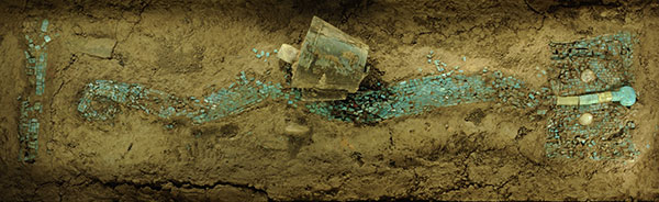 夏文化探索是实证中华文明5000多年历史的关键环节。自20世纪50年代以来,中国社会科学院考古研究所对二里头遗址的考古发掘,发现了大型建筑基址、祭祀遗址、作坊区和贵族墓葬区,出土青铜礼器、玉礼器、绿松石龙形器等珍贵文物,显示出这一时期社会已进入王国时代,二里头遗址也明显具有都邑聚落性质。图为2002年二里头遗址出土的绿松石龙形器。二里头夏都遗址博物馆供图
