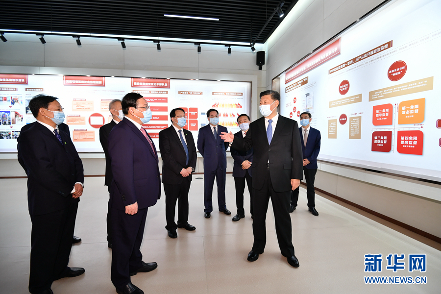 2020年11月12日,浦东开发开放30周年庆祝大会在上海市举行。中共中央总书记、国家主席、中央军委主席习近平在会上发表重要讲话。这是当天上午,习近平等参观“在国家战略的引领下——浦东开发开放30周年主题展”。新华社记者 殷博古/摄
