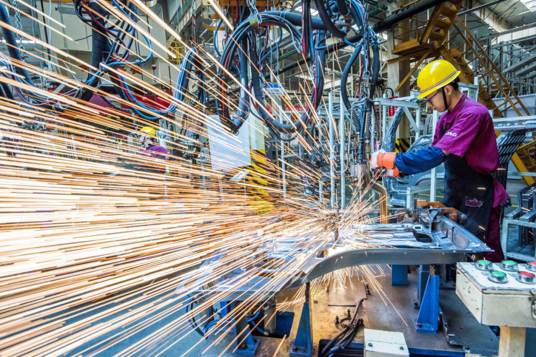 今年以来,我国统筹疫情防控和经济社会发展,加强宏观政策应对力度,推动经济稳步前行、逐步向好、不断升级,我国经济前三季度同比增长0.7%,全年实现正增长已成定局。图为2020年9月15日,工人在江淮汽车山东分公司冲焊车间内焊接作业。 人民图片 王继林/摄