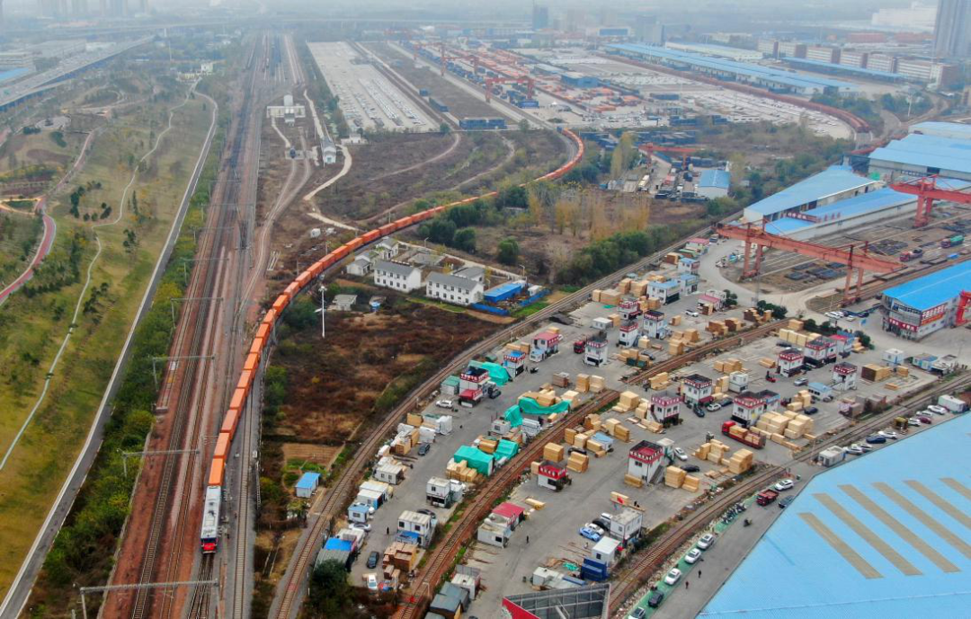 据中国国家铁路集团有限公司统计显示,截至11月5日,中欧班列今年开行已达10180列,再次创造新纪录,战略通道作用更加凸显,为维护国际产业链供应链安全稳定提供了有力支撑。图为2020年11月20日,中欧班列(中国郑州至芬兰赫尔辛基)驶出中国铁路郑州局集团有限公司圃田车站(无人机照片)。 新华社记者 郝源/摄