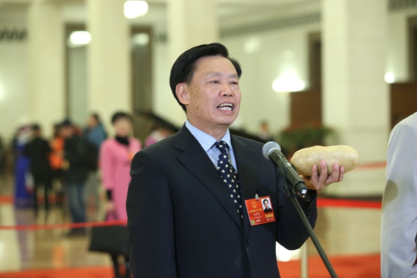 图为2018年全国两会期间,身为全国人大代表的朱有勇院士,手拿一颗硕大的马铃薯,现身人民大会堂“代表通道”,向中外媒体讲述科技扶贫的故事。云南农业大学党委宣传部供图