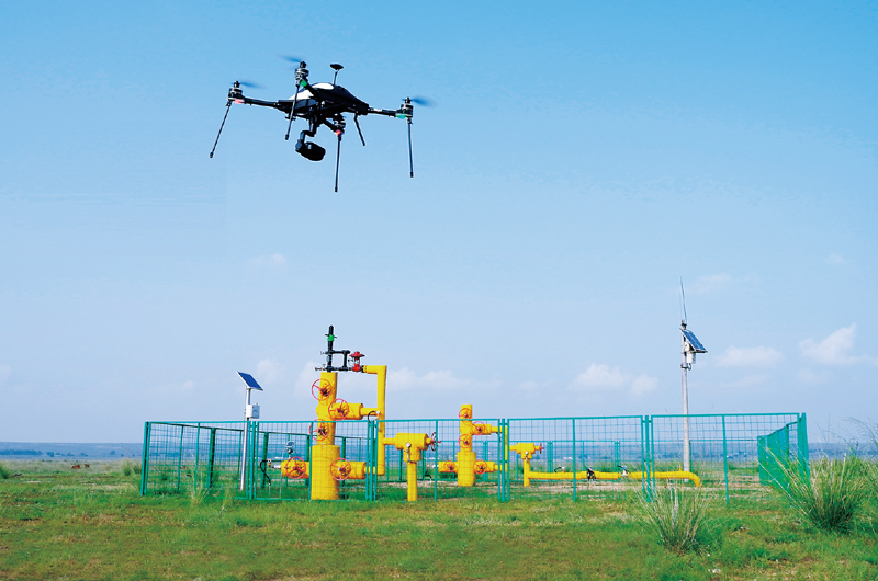 长庆油田加速新一代高新技术应用,以无人机、智能机器人代替人工巡线巡检,有效解决了管线多、站点多、人员少、地面环境复杂等问题,应急处置能力大幅提升。图为2020年6月23日,位于苏里格气田中部区域的采气四厂作业一区,无人机正代替人工进行巡检作业。 长庆油田供图 徐志武/摄