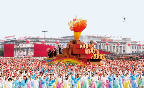 2019年10月1日,庆祝中华人民共和国成立70周年大会在北京天安门广场隆重举行。这是群众游行中的“凝心铸魂”方阵。 新华社记者 李欣/摄