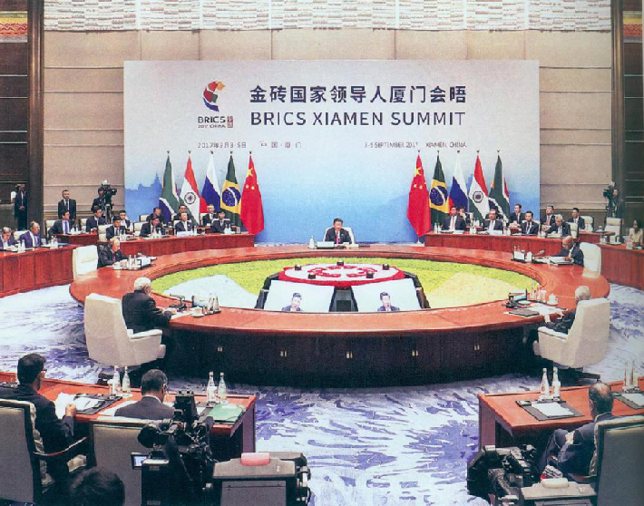 2017年9月4日,习近平总书记在厦门国际会议中心主持金砖国家领导人第九次会晤,并发表题为《深化金砖伙伴关系,开辟更加光明未来》的讲话。图片来源于《习近平谈治国理政》第二卷。