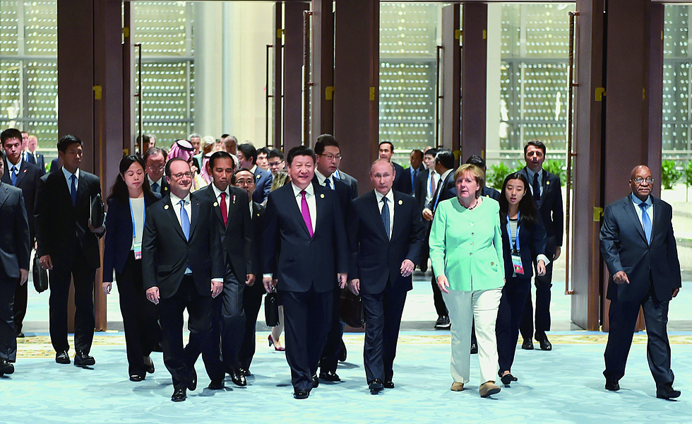 2016年9月4日,习近平总书记在杭州国际博览中心主持二十国集团领导人第十一次峰会并致开幕词。这是习近平与二十国集团成员和嘉宾国领导人、有关国际组织负责人步入会场。 图片来源于《习近平谈治国理政》第二卷。