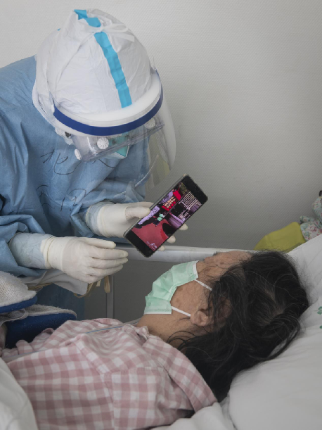 2020年3月23日,华中科技大学同济医学院附属同济医院中法新城院区,北京大学第一医院援鄂医疗队“90后”护士王周圳在帮助患者用手机与家人视频通话。中国人口报记者 潘松刚/摄