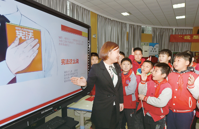 图为2018年12月3日,安徽省合肥市经开区明珠居委会法律援助律师在给明珠小学的学生们讲解宪法知识。新华社记者 郭晨/摄