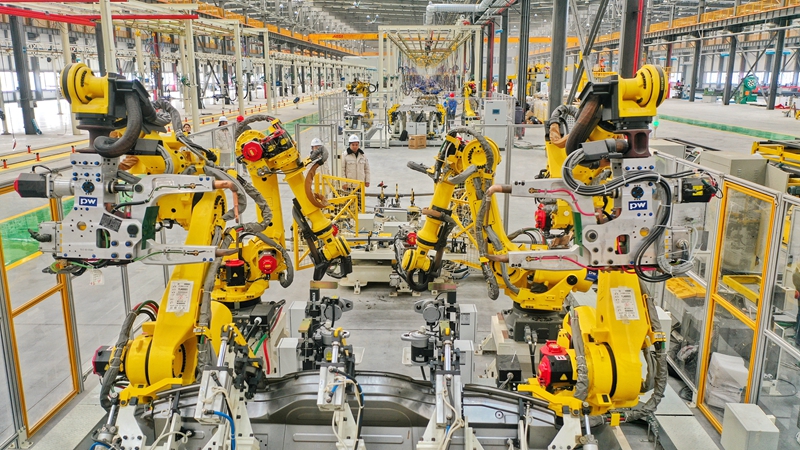 2021年1月7日,在位于浙江省湖州市莫干山高新区的中车交通启航新能源商用车零部件生产基地项目制件焊接车间,机械手正在自动化生产线上开展作业。 人民图片 谢尚国/摄