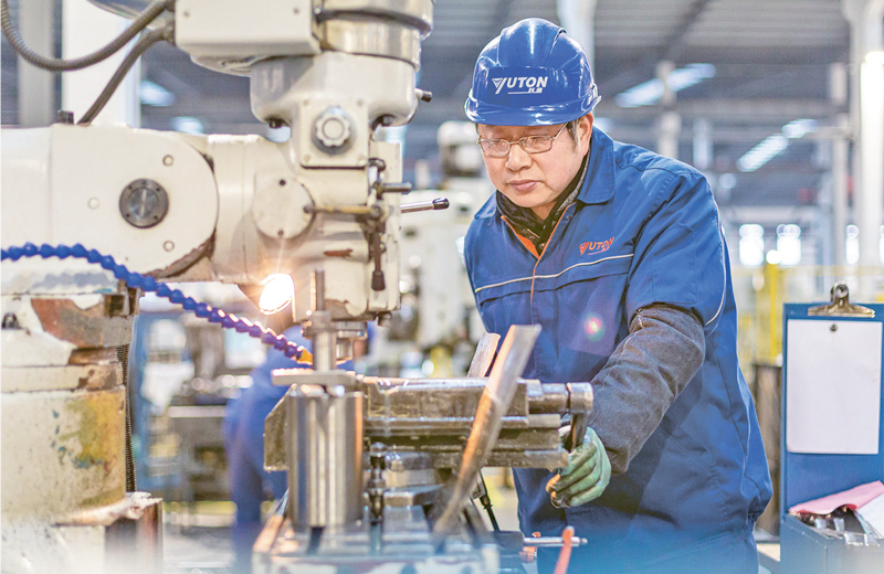 江苏省海安市在科学防控疫情及时帮助民营企业迅速恢复产能的同时,出台一系列政策鼓励民营企业开展技术创新和新品研发,形成核心竞争力,拓展国内外市场,带动务工人员稳定就业。图为2020年12月29日,位于江苏海安经济技术开发区的南通跃通数控设备有限公司生产车间内,工人们正在赶制产品订单。人民图片 翟慧勇/摄