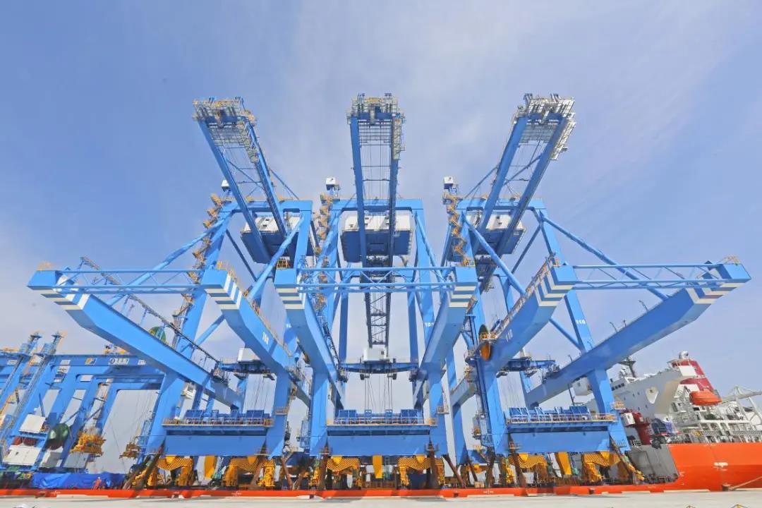 山东港口青岛港自动化码头将工业互联网与码头生产场景深度融合,创新运用物联网、大数据、云计算、人工智能、自动控制、机器人等技术,在自动化码头总平面布局、业务流程、生产调度、装卸工艺、集成建设等方面实现突破性进展,取得了十项科技创新。图为全球首创非等长后伸距自动化桥吊,该桥吊后伸距减少12米,减少自重50余吨,减少陆侧轮压6吨,降低码头土建成本和设备运行维护成本。 山东港口集团供图