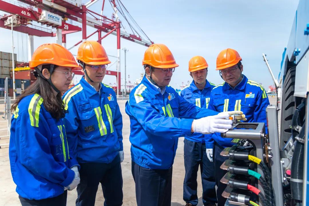 图为山东港口青岛港“连钢创新团队”成员在码头现场研究如何改进自动导引车(AGV)循环充电系统。
