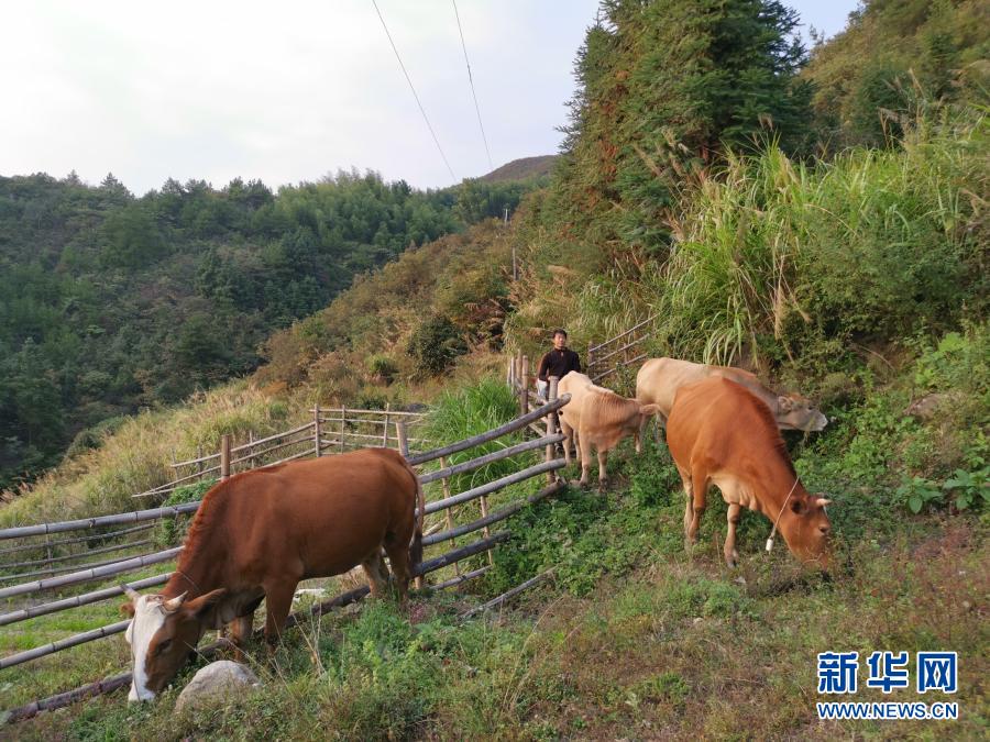 湖南省平江县虹桥镇大青石村村民李存泉在放牛(2020年10月13日摄)。新华社记者 周楠/摄