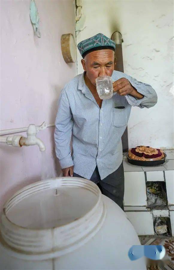 在伽师县英买里乡阿亚克兰干村村民克里木·萨依木家厨房,克里木·萨依木直接饮用水管里流出的放心水(2020年6月9日摄)。新华社记者 赵戈/摄