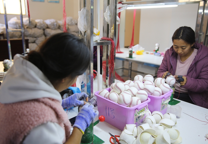 近年来,云南省怒江傈僳族自治州在易地搬迁安置点引进珠海企业建设棒球生产车间,全州共有30余个车间投入使用,上千名群众在家门口实现就业增收。图为2021年1月27日,云南怒江傈僳族自治州泸水市群众在城墙坝安置点的棒球缝制车间工作。 新华社发 梁志强/摄
