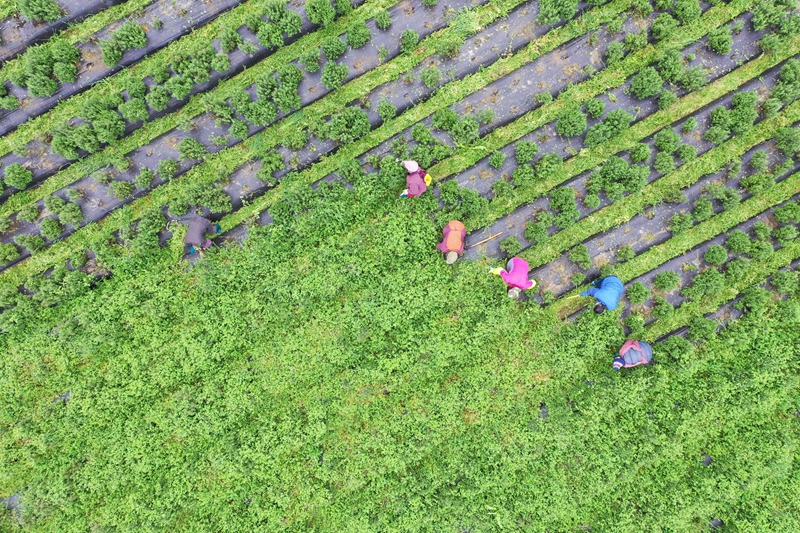 2020年3月1日,湖南省怀化市通道侗族自治县万佛山镇石壁村,农民在中草药种植基地劳动(无人机照片)。新华社发 吴三东/摄