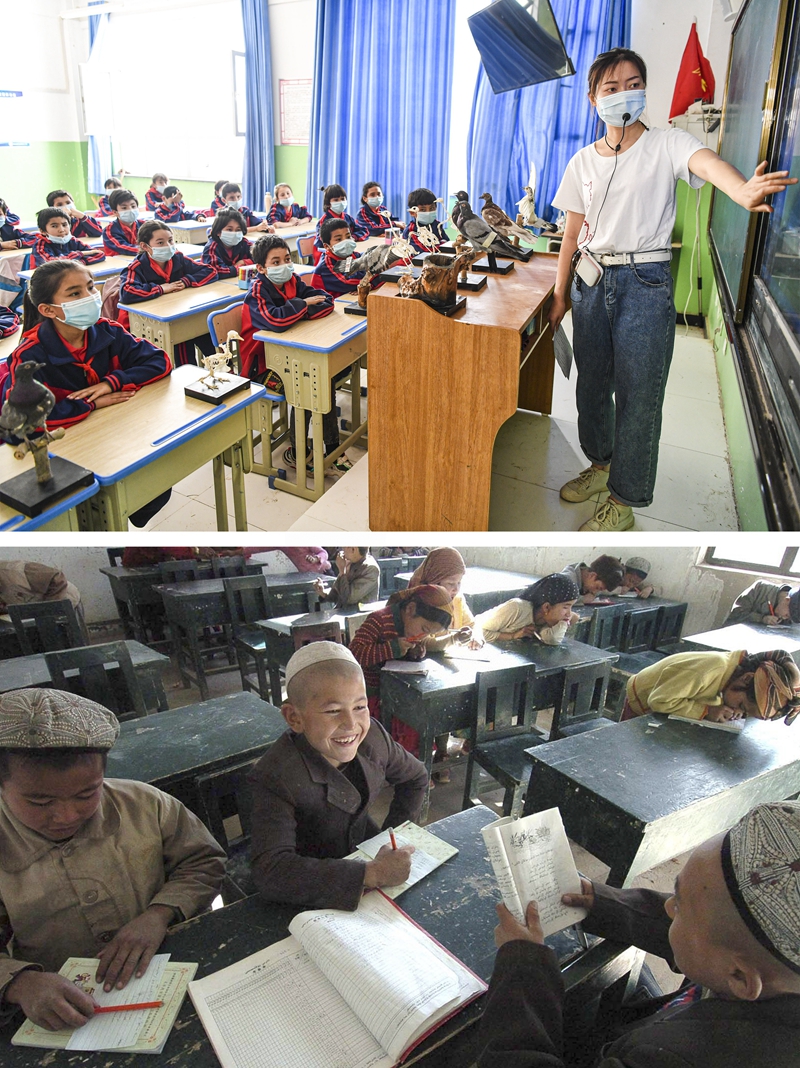 上图为2020年5月16日,在地处塔克拉玛干沙漠腹地的新疆和田县塔瓦库勒乡巴克墩小学,支教老师在给学生讲解科普知识(新华社记者 王菲/摄);下图为2005年11月7日,新疆于田县达里雅布依乡寄宿学校的孩子们在上自习课(资料照片)。