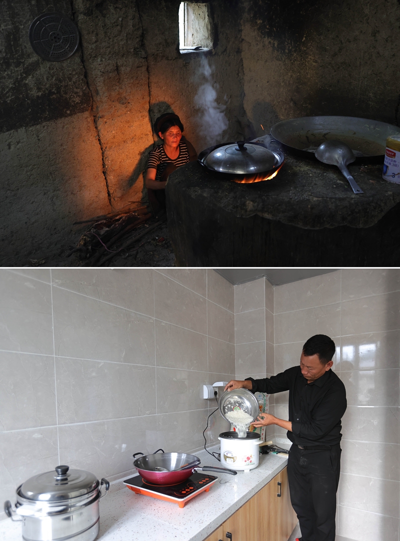 2020年5月13日,四川省昭觉县支尔莫乡“悬崖村”——阿土列尔村高山区的31户贫困户搬到县城集中安置点。上图为四川省昭觉县支尔莫乡村民莫色拉则的妻子在“悬崖村”的家中厨房里做饭(2020年5月12日摄);下图为莫色拉则在昭觉县城易地扶贫搬迁安置点依乌社区的新家里做饭(2020年5月13日摄)。