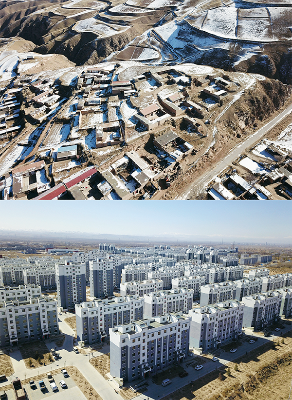上图为2018年2月6日拍摄的古浪县黄羊川镇石城村原貌(无人机照片);下图为2020年3月10日拍摄的石城村群众易地扶贫搬迁入住的古浪县黄花滩生态移民区绿洲生态移民小镇(无人机照片)。新华社记者 范培珅/摄