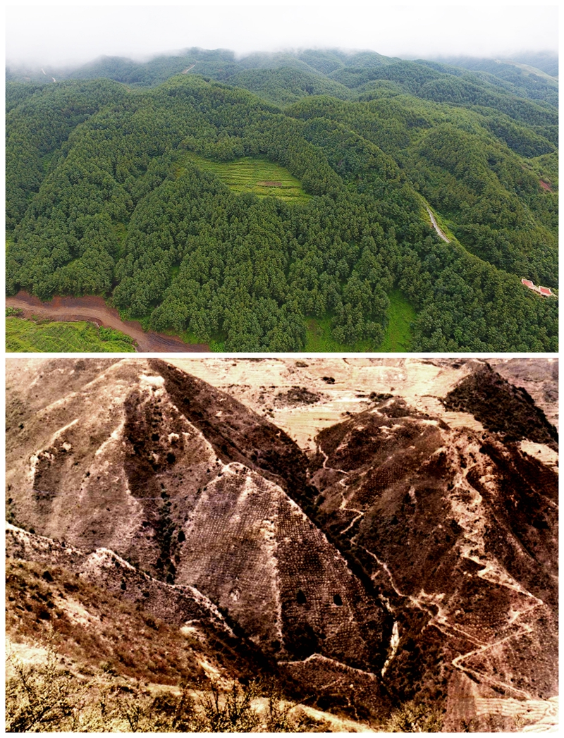 2020年11月23日下午,贵州省宣布剩余的9个贫困县退出贫困县序列。至此,贵州66个贫困县全部脱贫摘帽。上图为2019年7月25日拍摄的贵州省赫章县河镇乡海雀村披绿的山坡(无人机照片,新华社记者 杨文斌/摄);下图为上世纪80年代海雀村石漠化严重的山坡(资料照片)。