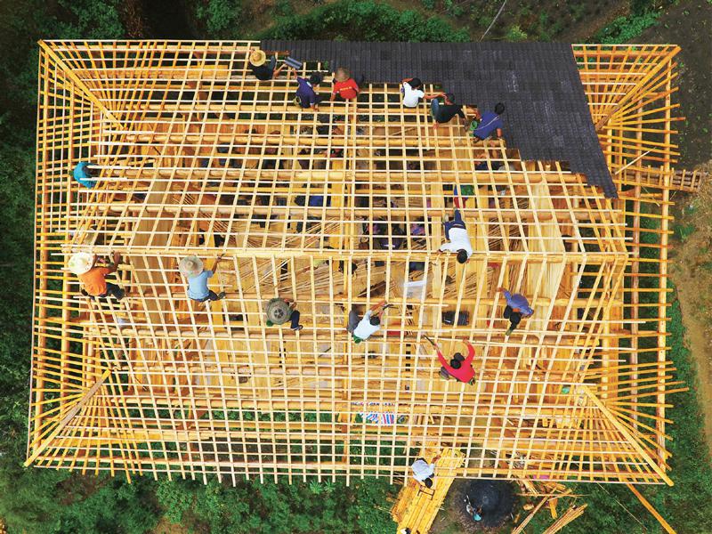 广东廉江市和广西融水苗族自治县自2017年9月结成对子,开展“携手奔小康”帮扶工作,针对山区群众建房材料运输成本高等实际困难,加大对贫困群众危旧房改造的补助力度,帮助他们实现安居梦。图为2019年9月3日,在黔桂乌英苗寨,群众正在帮助贫困户修建新木楼。 新华社记者 黄孝邦/摄