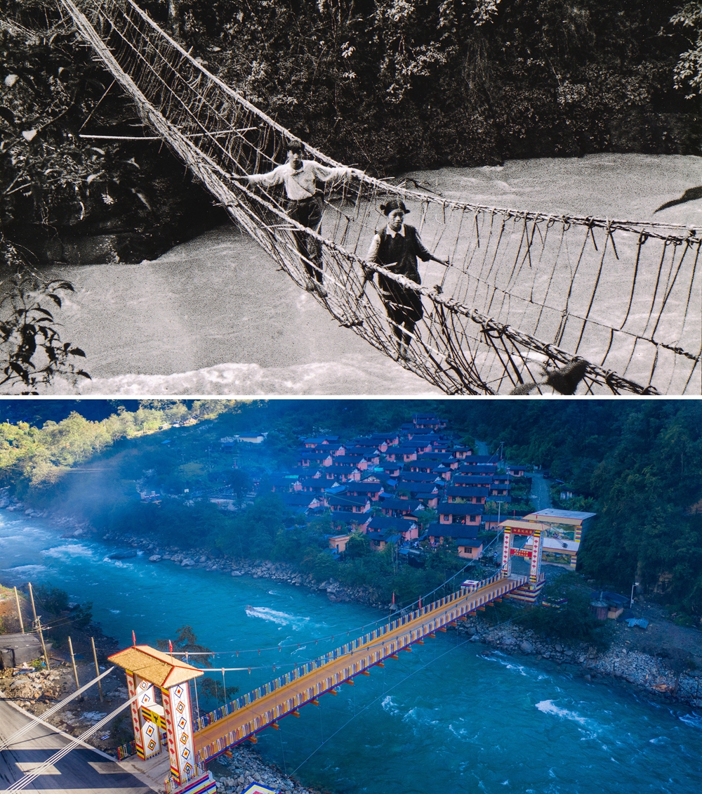 上图:独龙族群众通过藤篾桥(资料照片);下图:独龙江乡白来感恩大桥(2020年10月29日摄,无人机照片,新华社记者胡超摄)。新华社发