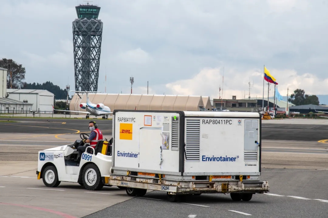 2021年2月20日下午,首批由中国科兴公司生产的新冠疫苗运抵哥伦比亚首都波哥大。新华社发(哥伦比亚总统府供图)