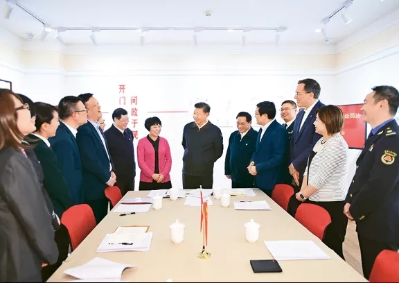 2019年11月2日至3日,中共中央总书记、国家主席、中央军委主席习近平在上海考察。这是2日下午,习近平在长宁区虹桥街道古北市民中心,同正在参加立法意见征询的社区居民代表亲切交流。新华社记者 谢环驰/摄