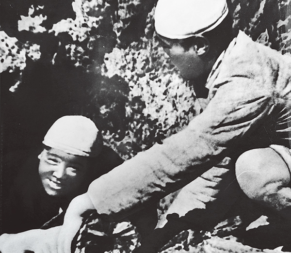 1944年,张思德响应党中央关于开展大生产运动的号召,主动报名参加中央机关生产小分队,到安塞烧木炭。9月5日,炭窑在雨中发生崩塌,张思德将另一名战士推出窑口,自己却被埋在坍塌的土堆里,光荣殉职。图为和战友一起烧炭的张思德(左),这是他生前留下的唯一一张照片。 新华社发
