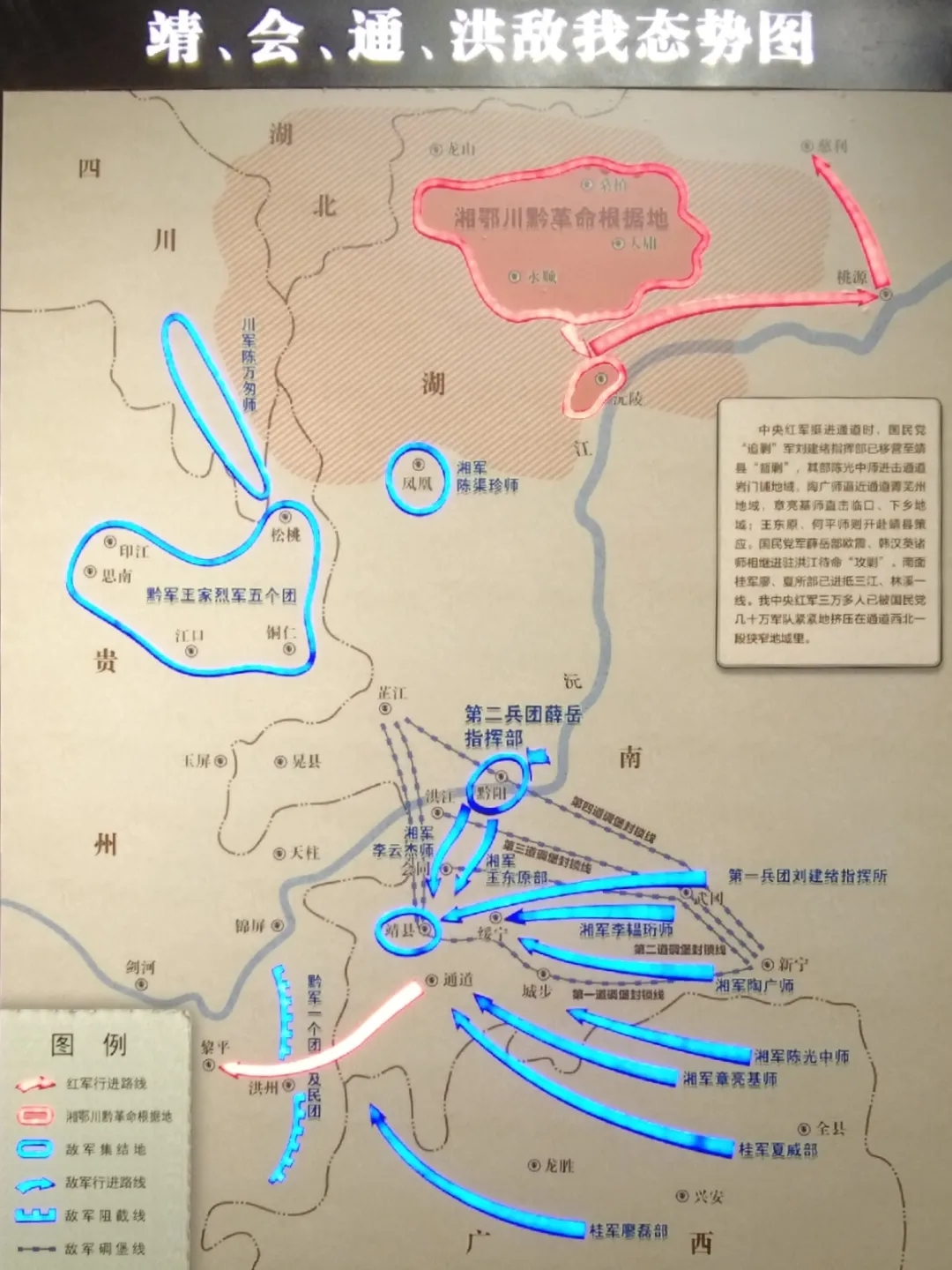据通道转兵纪念馆馆长郑湘介绍:“当时,为防止中央红军北上与红二、六军团会合,数十万敌军早已抢先在通道以北进入阵地,一个更加凶险的危局眼看就要来临”。