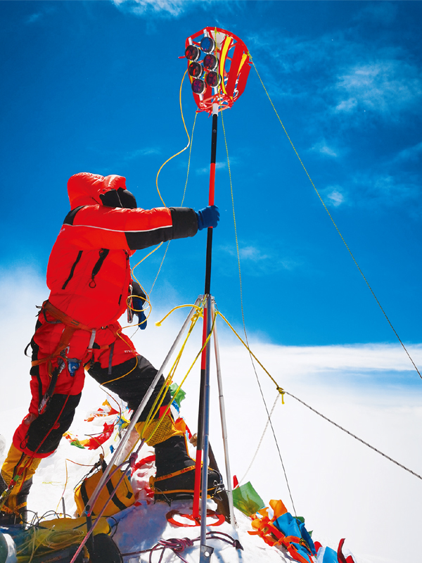 2020珠峰高程测量,将我国自主研制的北斗卫星导航系统首次应用于珠峰峰顶大地高的计算,获取了更长观测时间、更多卫星观测数量的数据。图为2020年5月27日珠峰高程测量登山队队员在峰顶开展测量工作。 新华社特约记者 扎西次仁/摄