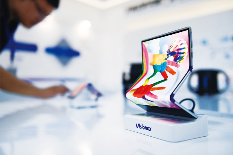 AMOLED柔性显示屏具有自发光、高分辨率、响应速度快、可实现弯曲的特点,可广泛应用于手机、电脑、可穿戴设备等终端产品。图为维信诺(合肥)第六代全柔AMOLED生产线建设工程展厅内陈列的柔性显示屏产品。 安徽日报记者 徐旻昊/摄