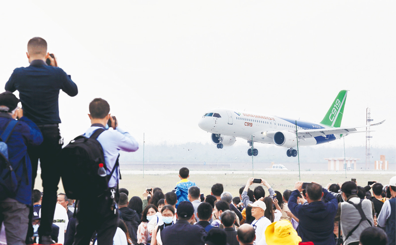 “十三五”时期,创新驱动发展成果与广阔的应用场景交汇融合,显著提升我国装备制造水平,持续完善交通运输体系,深入推进区域协调发展,支撑我国经济高质量发展取得新成效。图为国产C919客机在进行动态展示。 中国工程院供图