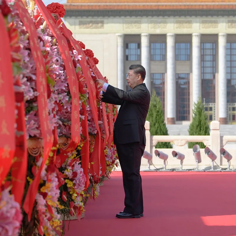 2020年9月30日上午,党和国家领导人习近平、李克强、栗战书、汪洋、王沪宁、赵乐际、韩正、王岐山等来到北京天安门广场,出席烈士纪念日向人民英雄敬献花篮仪式。这是习近平整理花篮上的缎带。新华社记者 申宏 摄
