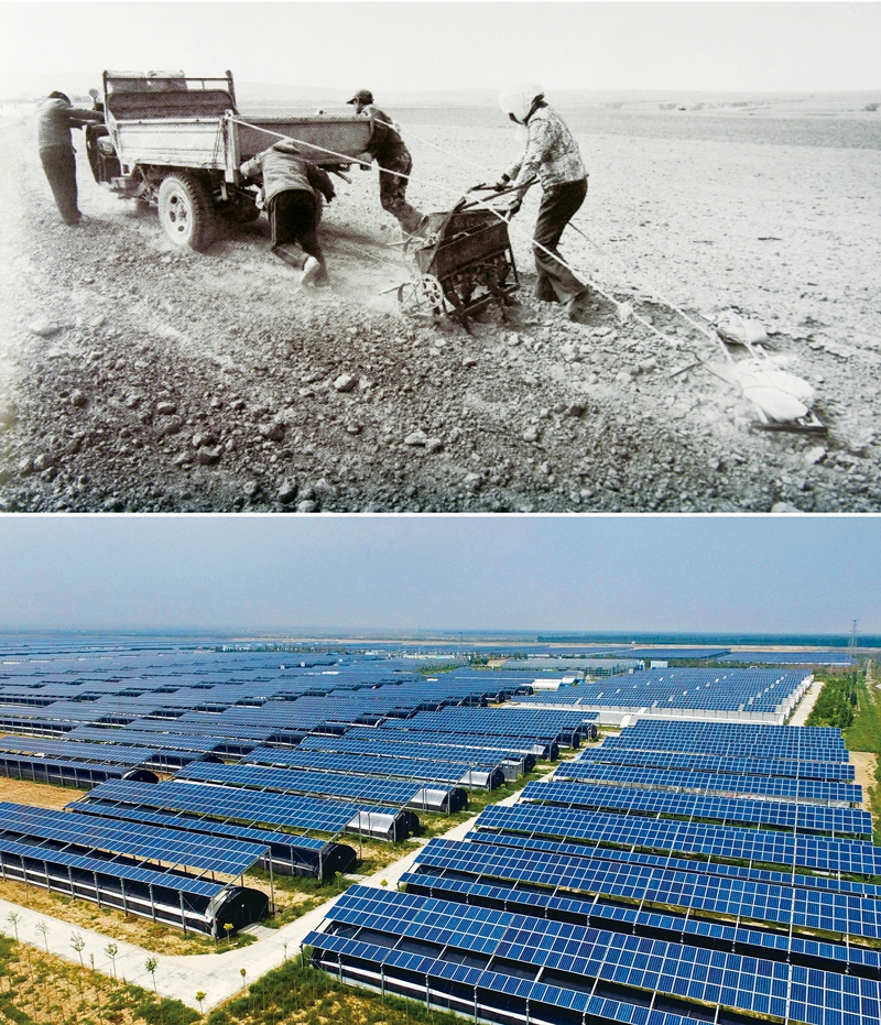 东西部扶贫协作创奇迹,宁夏闽宁镇旧貌换新颜。自福建与宁夏结成帮扶对子以来,20多年间通过资金支持、引入项目、培训技能、帮扶产业等多方面举措,在戈壁旱塬间书写下闽宁扶贫协作的壮丽篇章。上图为宁夏永宁县闽宁镇建设初期,移民群众在戈壁滩上开荒种田(资料照片 新华社发)。下图为闽宁镇原隆移民村的光伏蔬菜大棚(新华社记者 王鹏/摄)。