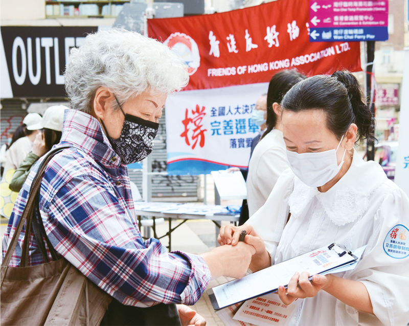 2021年3月12日,香港市民到湾仔街站签名支持完善香港选举制度,落实“爱国者治港”。 中新社记者 李志华/摄