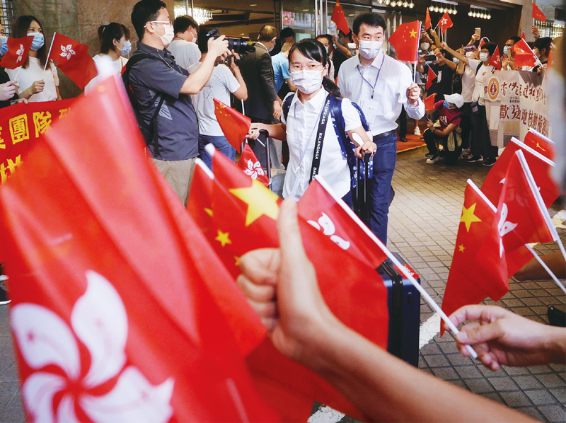 2020年9月16日,圆满完成协助香港特区抗疫任务的内地核酸检测支援队队员们离开香港,香港市民夹道欢送。 新华社记者 王申/摄