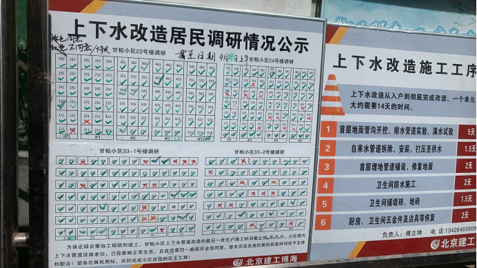 图为甘柏小区上下水改造居民调研情况和改造工序公示。张淑虹/摄