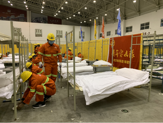 2020年2月6日,共青团组织武汉地铁青年突击队抢建武汉客厅“方舱医院”。共青团中央供图 章旭/摄