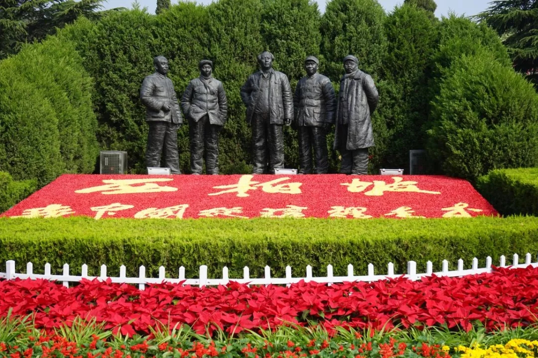 西柏坡纪念馆广场上绿树掩映,鲜花簇拥着毛泽东、朱德、刘少奇、周恩来、任弼时“五大书记”铜像,雕像前是几个醒目的大字:西柏坡——新中国从这里走来(黄镇将军题词)