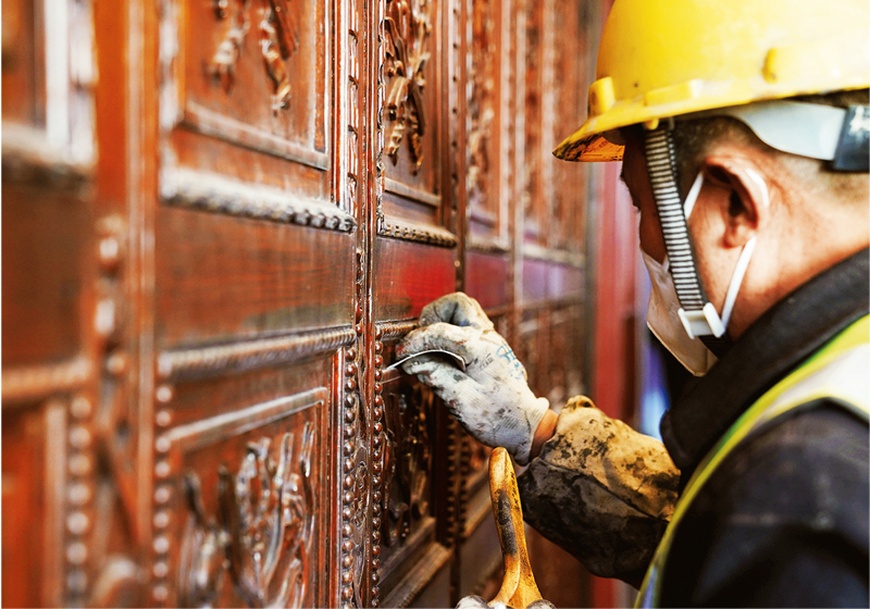 位于上海市兴业路76号的中共一大会址纪念馆实施修缮改造。图为2021年3月22日,工人在清理木质雕花板。 新华社记者 刘颖/摄
