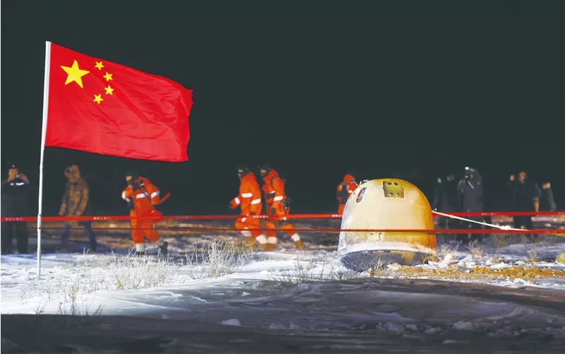 嫦娥五号任务首次实现了我国地外天体采样返回。图为2020年12月17日凌晨,嫦娥五号返回器携带月球样品,在内蒙古四子王旗预定区域安全着陆。 新华社记者 连振/摄