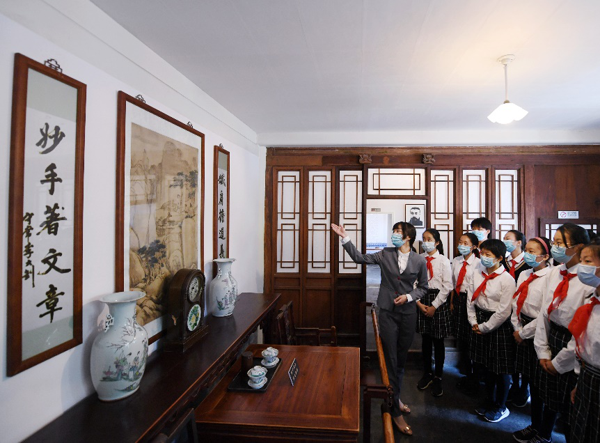 2021年6月1日,中国共产党早期北京革命活动旧址正式面向社会公众开放。本次集中开放的革命活动旧址包括北京李大钊故居、《新青年》编辑部旧址(陈独秀旧居)、京报馆旧址(邵飘萍故居)、陶然亭慈悲庵、“亢慕义斋”旧址、中山公园来今雨轩、赵家楼遗址、二七惨案长辛店旧址,以及李大钊烈士陵园、长辛店二七纪念馆、马骏烈士墓等重要党史人物故居、会议场所、重大历史事件发生地以及重要纪念设施。图为讲解员为前来参观李大钊故居的学生做介绍。 新华社记者 张晨霖/摄