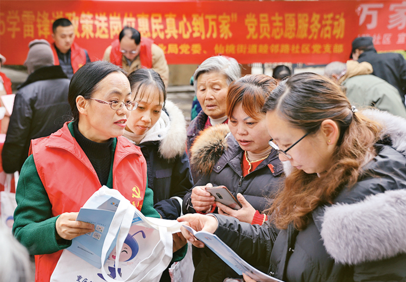 公共服务是落实社会保障政策的重要载体,必须坚持贴近实际、贴近生活、贴近群众,聚焦重点政策,突出精细化、精准化宣传,把社会保障政策向基层、向大众讲清讲透。图为2021年3月5日,重庆市人社局党员志愿者深入渝北仙桃社区,现场为群众讲解有关政策。 人力资源社会保障部供图