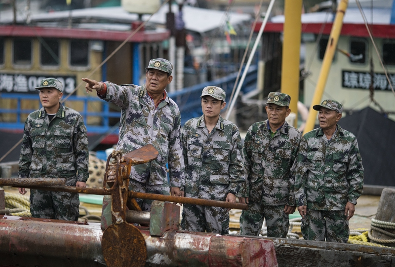为国护海模范王书茂:永远红心向党。在海南省琼海市潭门镇,“七一勋章”获得者、潭门海上民兵连副连长王书茂(左二)在组织民兵开展训练任务。新华社发 宋国强/摄