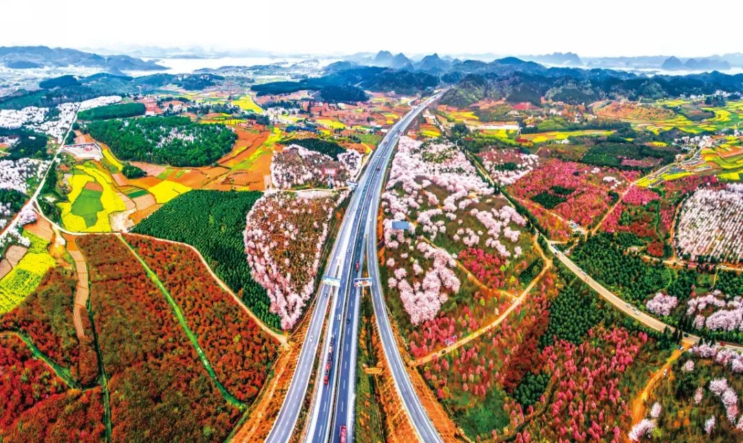 习近平总书记对贵州脱贫攻坚、全面小康十分关心,多次作出重要指示。贵州牢记习近平总书记嘱托,按时高质量打赢了脱贫攻坚战,夺取全面建成小康社会伟大胜利。图为穿行在贵安花海间的沪昆高速公路。