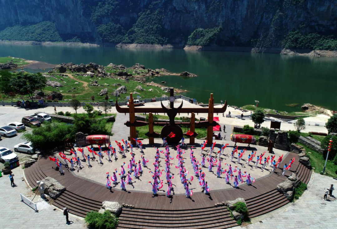 黔西市化屋村曾经是一个贫困发生率高达63.6%的穷山沟,通过精准扶贫,人均可支配收入从2012年的2400元增加到2020年的11500元,世代受贫穷困扰的苗家儿女过上了小康生活。图为2021年6月6日,人们在化屋村码头广场表演舞蹈。