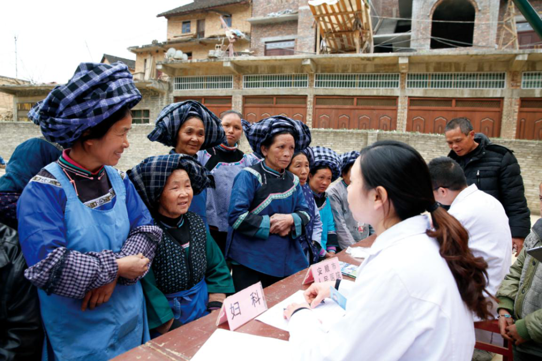 习近平总书记指出,没有全民健康,就没有全面小康。贵州建成省市县乡四级远程医疗网,建立基本医保、大病保险、医疗救助“三重医疗保障”,每个行政村都有1个卫生室且不少于1名合格村医。图为安顺市人民医院到镇宁自治县简嘎乡义诊。
